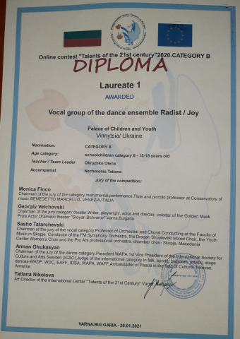 Зразковий художній колектив «Вокальна група ансамблю танцю «РАДІСТЬ», який здобув 1 місце в Міжнародному он-лайн конкурсі «Таланти ХХІ століття» у Болгарії. В нашій категорії змагались 455 колективів з усього світу. Тому перемога ще більш вагома.