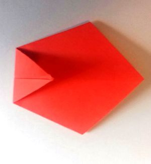 1.Беремо одну сторону квадрата і загинаємо її по діагоналі, уздовж вже наявної складки. Так само по діагоналі загин другу сторону. У нас виходить базова форма - «Повітряний змій».