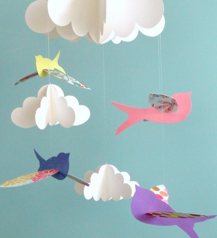 Дитяча, в якій під стелею кружляють маленькі різнокольорові пташки, виглядає просто чарівно. Така кімната не залишить байдужим нікого, навіть дорослого.