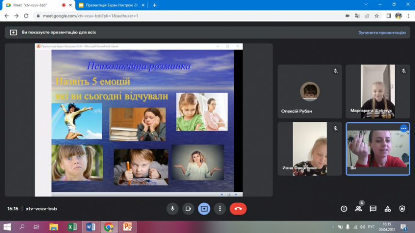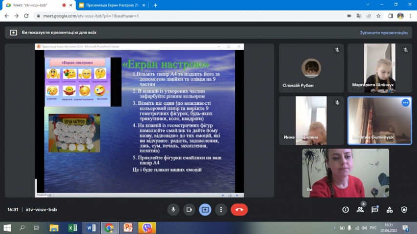 У Вінницькому міськом палаці дітей та юнацтва відбулась чергова онлайн зустріч дітей-переселенців (учнів початкової школи) із психологом. Цього разу ми створювали "Екран настрою", вправа яка розвиває емоційний інтелект, вчить впевнено та чітко характеризувати свої емоції, говорити та проявляти їх. Діти із захопленням займались творчістю, працювали з кольором, кожен створив свій особливий екран настрою! Всі роботи були цікаві та наповнені почуттями добра, радості та віри, що все буде добре!