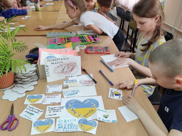 Також на початку творчої роботи вони разом з дітками написали листівки для наших воїнів-захисників, які передали волонтерами на передову. Усі дітки прагнуть МИРУ і дуже хотять повернутися у свої мирні міста до рідних домівок! Все буде Україна!!!