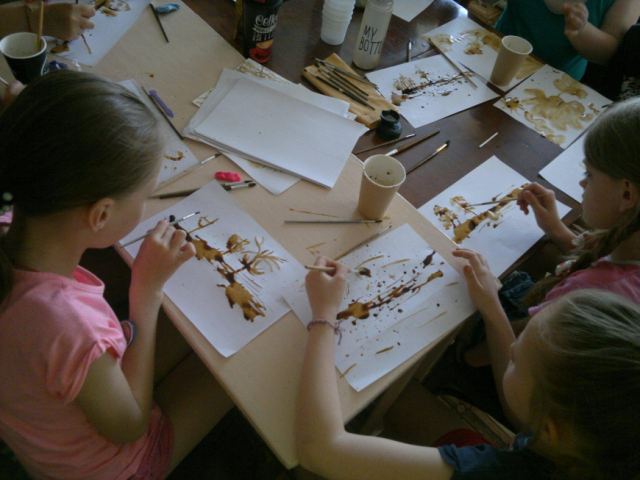 З розлитої кави можна на папері створити цілий світ, наповнений сюжетами та історіями, або просто намалювати пейзаж рідного краю. Такий живопис досить цікавий для дітей тому що створюється спонтанно.