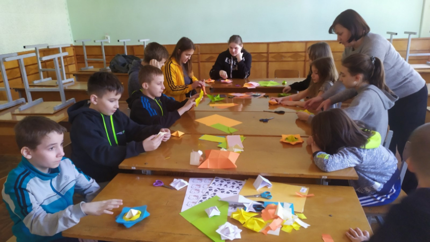 У цей важкий для всіх нас час педагоги відділу науки і технічної творчості Вінницького міського палацу дітей та юнацтва долучились до проведення майстер-класів для дітей, які виїхали з територій, де ведуться бойові дії. Керівник гуртка «Орігамі» Остапенко Г.В. та керівник гуртка початкового технічного моделювання Ліщина О.В. провели майстер-клас з паперопластики, в цікавій формі познайомили дітей з винайденням паперу, з поняттям «орігамі» , з задоволенням діти перетворювали папір у витвір мистецтва, навчились виготовляти іграшку-антистресс та підставку під телефон. Весела та творча атмосфера супроводжуваллась спілкуванням.