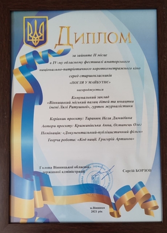 Цього року на розсуд журі вихованці гуртка дитячої мультиплікації представили анімаційний фільм «У назвах вулиць» та вибороли І місце, а юні журналісти - документальний фільм «Код нації. Григорій Артинов», з яким посіли ІІ місце.