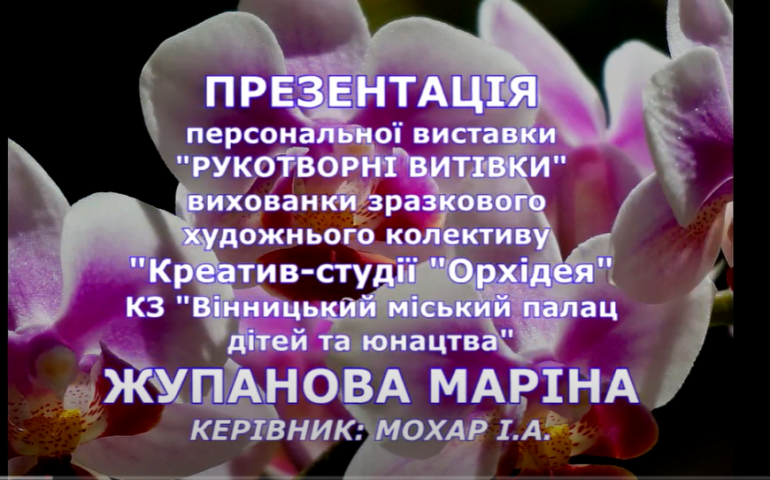 Знайомтесь, найкращі вихованці зразкового художнього колективу "Креатив-студії "Орхідея" КЗ "Вінницький міський палац дітей та юнацтва імені Лялі Ратушної", які весь свій вільний час присвячують творчості і прославляють наш Палац в місті, області, державі і за її кордоном - Мельниченко Оля, Жупанова Маріна та Українець Дарина. Стипендіати міської ради, переможці Міжнародних, Всеукраїнських, обласних та міських виставок і конкурсів. Сьогодні вони презентують свою персональну виставку "Рукотворні витівки". Це творчий звіт наших дівчат за роки навчання в рідному Палаці, історія їхнього успіху і перемог! Дитячі душі тут навчаються літати, щоб потім не згубитися в житті!