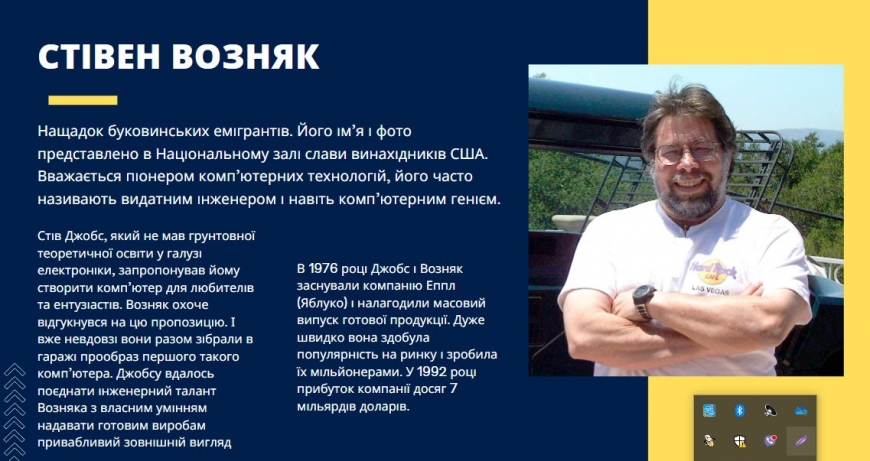 У гуртку Web-дизайну (кер. Кравець Р.П.) під час відеопрезентації "Українці - генії в ІТ", діти дізнались про роль українських вчених у розвитку світової інформатики та їхні вагомі кроки в напрямку розвитку інформаційних технологій, про легендарні постаті української інформатики та кібернетики.