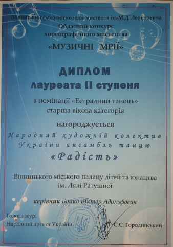 В березні 2021р. ансамбль танцю «Радість» взяв участь в обласному конкурсі хореографічного мистецтва «Музичні мрії», організатором якого був Вінницький фаховий коледж мистецтв ім. М.Д.Леонтовича.
