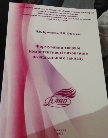 Наш заклад презентував методичний посібник «Формування творчої компетентності вихованців позашкільного закладу» (автори: Н.В. Кузнєцова, Л. П. Очеретна). У представленому дослідженні висвітлені проблеми та нові підходи до навчально-виховного процесу в позашкільному закладі, який попри всі зміни у суспільстві лишається найбільш творчою освітньою ланкою.