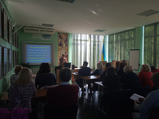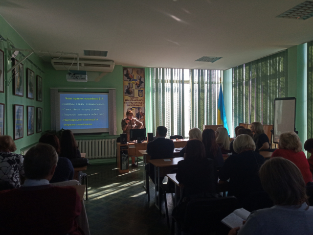 На захід була запрошена професор кафедри екології, природничих та математичних наук, доктор педагогічних наук, академік Академії наук вищої освіти України Тарасенко Галина Сергіївна, яка наголосила, що сучасна освіта знаходиться на етапі реформування та модернізації, звернула увагу на те, чим сучасні діти відрізняються від попередніх поколінь, акцентувала увагу педагогів закладу на педагогіці партнерства, яка вимагає переосмислення ролі педагога, що в свою чергу полягає в оновленні професійного мислення й відповідних цілеспрямованих дій: постійному аналізі власної педагогічної діяльності, орієнтованої на самоосвіту; відстеження результативності своєї роботи через систему моніторингу. І саме головне – діти очікують від сучасної освіти більшої самостійності, незалежності і меншої кількості авторитетів. Змінюються і вимоги до педагога: він сьогодні не ретранслятор, а вчитель – коуч, тренер, фасилітатор.